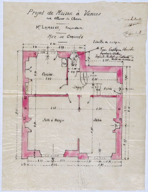 Plan du rez-de-chaussée de la maison Lambert par Michel, 1911. AM Vannes 5I162.Immatriculation
