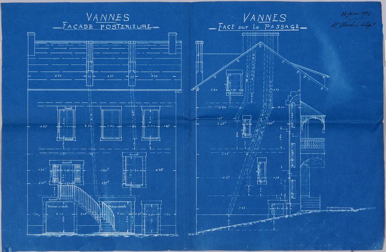 Elévation de la façade postérieure et de la face sur le passage par Huchet, février 1925. AM Vannes 5I162.Immatriculation