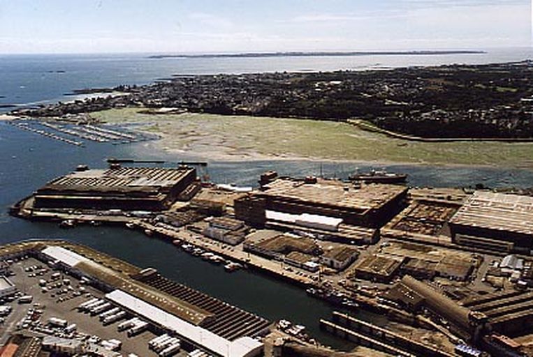 Vue aérienne oblique de la base de sous-marins de Lorient-Keroman : bunkers "KIII", "KI" et "KII" (Concours de la base de sous-marins, 1999)Immatriculation