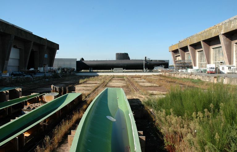 Vue du terre-plein - plate-forme de translation - situé entre les bunkers "KI" et "KII" (2005) : au centre, le sous-marin Flore (S645, lancé en 1960)Immatriculation