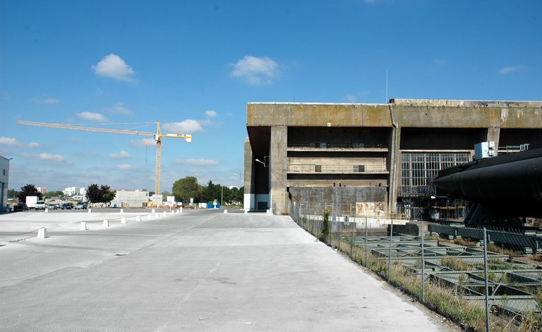 Vue de l'angle sud-ouest : contreforts et dalle de couverture (2005). Les quatres entrées/sorties situées au premier étage de la première alvéole correspondent à la caserne dite des 1000. A droite, le sous-marin Flore (S645, lancé en 1960) sur le terre-plein - plate-forme de translation - situé entre les bunkers "KI" et "KII"Immatriculation