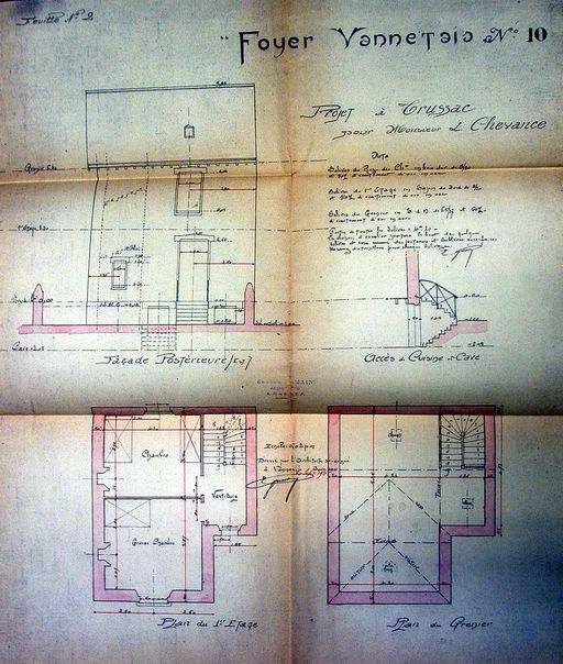 Elévation de la façade postérieure et plan au sol de la maison Chevance par E. Gemain, le 20 septembre 1911. AM Vannes 5 I 162.Immatriculation
