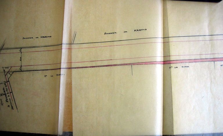 Projet d'établissement de trottoirs dans la rue Philippe Lebon. Partie médiane le long de la fonderie de Kerino, plan par Thiévard, 2 décembre 1930. AD Morbihan 3O 2182.Immatriculation