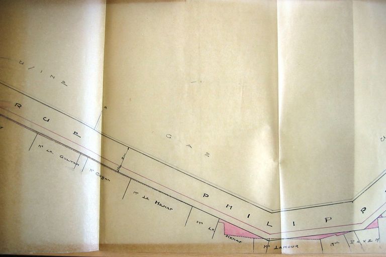 Projet d'établissement de trottoirs dans la rue Philippe Lebon. Partie au sud de la rue Ampère, plan par Thiévard, 2 décembre 1930. AD Morbihan 3O 2182.Immatriculation