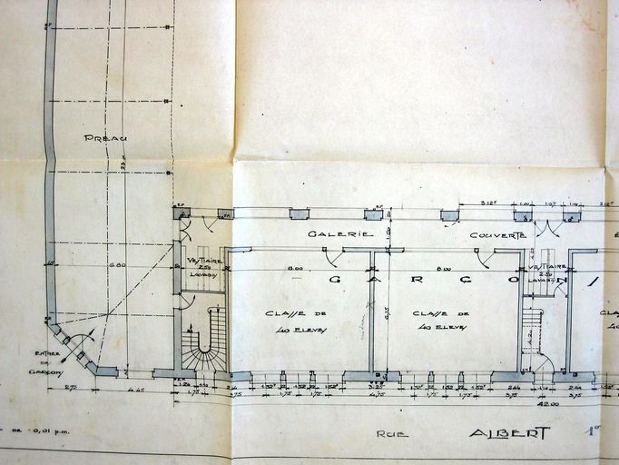 Plan du rez-de-chaussée de l'école, dressé par Thiévard, 30 juillet 1930 : détail de la section des garçons. AD Morbihan 2O 260/12.Immatriculation