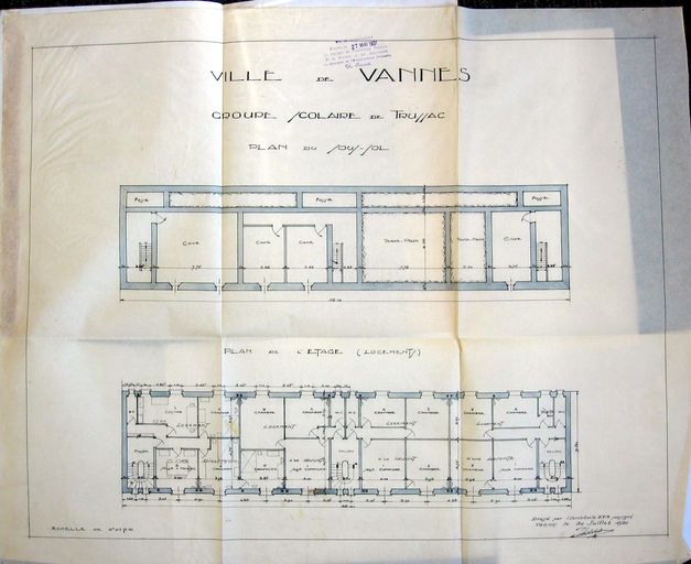 Plan du sous-sol et de l'étage de l'école, dressé par Thiévard, 30 juillet 1930. AD Morbihan 2O 260/12.Immatriculation