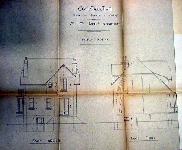 Elévations de la façade arrière et de la façade nord de la maison Jaffré par Santin, 20 juillet 1939. AM Vannes 5I162.Immatriculation