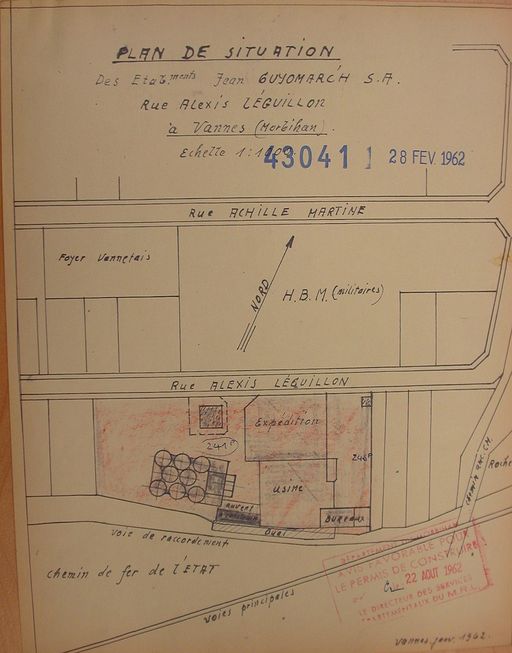 Plan de situation de Guyomarc'h dressé pour la construction d'un bâtiment entre le silo et l'usine approuvé le 22 aout 1962. AM Vannes 5I162.Immatriculation