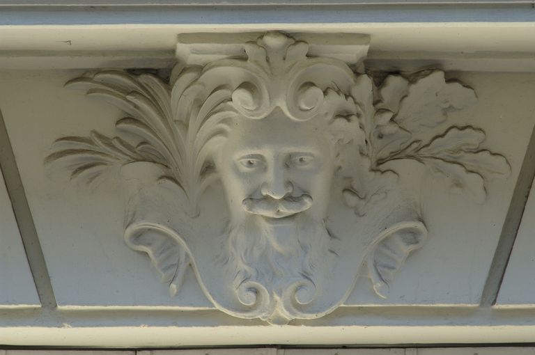 Clef passante sculptée d'une tête d'homme au-dessus de la fenêtre.Immatriculation