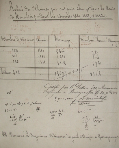 Relevé des navires qui ont prit charge dans la baie de Keralies entre 1880 et 1882 (AD 22)Immatriculation