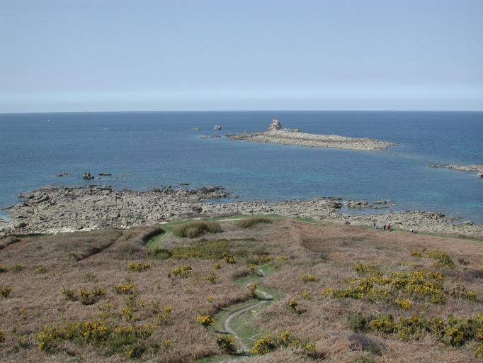 Vue du site sur-élevé de l'ancien corps de garde : la lande, le sentier côtier devant l'île au CorbeauImmatriculation