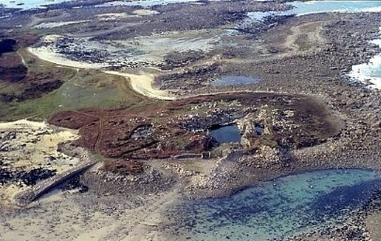 Vue générale de l'Île Agathon : remarquer la grance carrière, le quai et les bâtiments Paris, UTL Lannion)Immatriculation