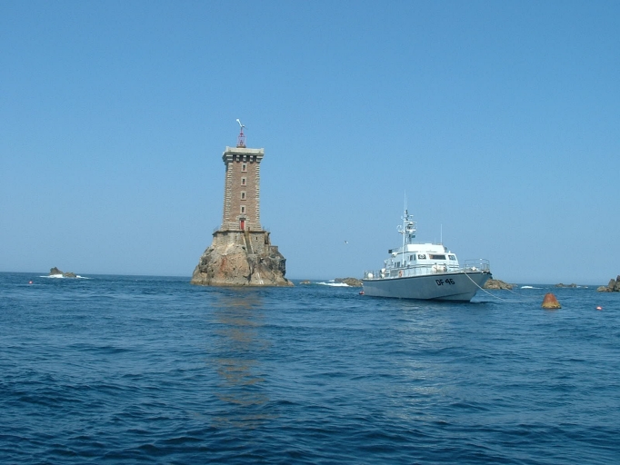 Vue actuelle du phare des Triagoz avec la vedette du service des Phares et BalisesImmatriculation