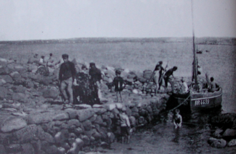 Déchargement d'un bateau goémonier du Finistère à la cale rustique du Port aux Bateaux (collection particulière)Immatriculation