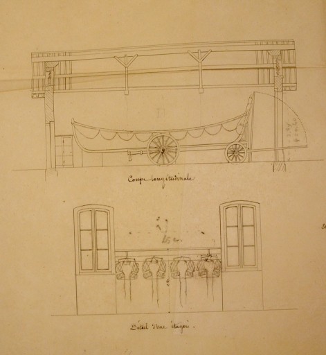 Plan de détail : coupe longitudinale, étagère, chariot et canot, 1866 (AD 22)Immatriculation