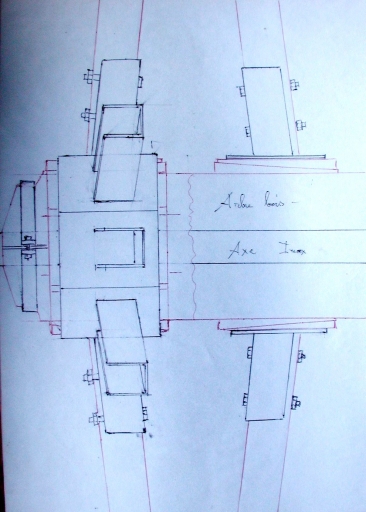 Dessin : essai de reconstitution d'un arbre en bois avec axe en inox et les pales en étoile à 8 branches (Jean Peillet)Immatriculation