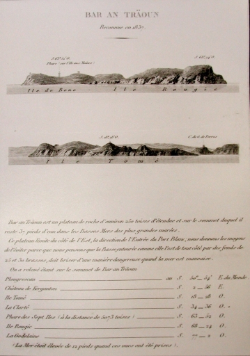 Vue de côte : Ile Bono et Ile Rouzic, reconnues en 1837 par Beautemps-Baupré : le phare de l'Île aux Moines, l'Île Tomé, le corps de garde de Perros (Le Pilote français, collection particulière)Immatriculation