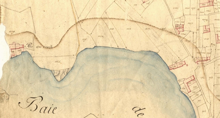 Extrait du cadastre de 1819 : le front de port de Ploumanac'h, dont Pen Crec'h : remarquer l'absence de bâti linéaireImmatriculation
