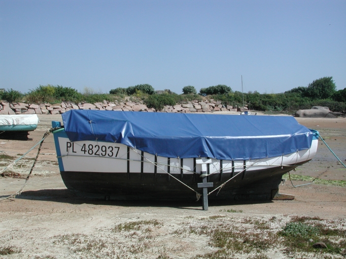 Vue générale d'un canot construit par Le Roux (Pl 482937) : grève de Sainte-AnneImmatriculation