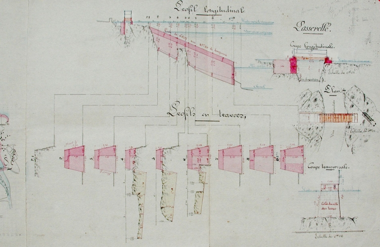 Plan : profil en log et en travers de la passerelle, 1882 (AD 22)Immatriculation