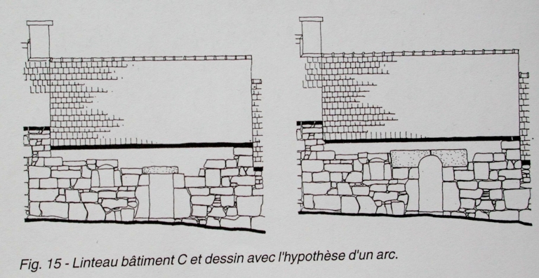 Linteau du bâtiment C et dessin avec l'hypothèse d'un arcImmatriculation