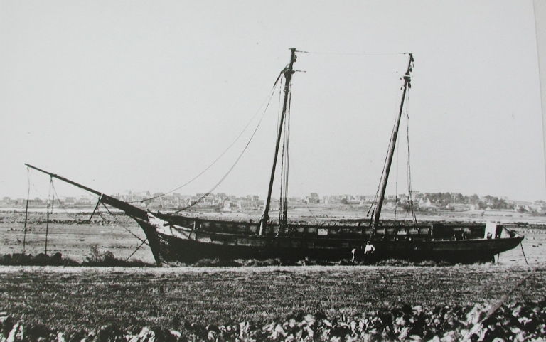 L'Alcide désarmée et condamnée au pillage, après son échouage : la mâture fut vendue à un armement d'Amérique du Sud (collection particulière)Immatriculation