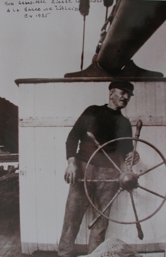 Pierre-Marie Le Cozic à la barre de l'Alcide avant son désarmement en 1935 (collection particulière)Immatriculation