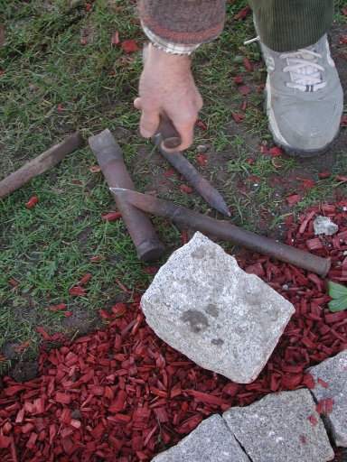 Les différents outils du tailleur de pierre : les grands poinçons, les ciseaux et le piche de paveurImmatriculation
