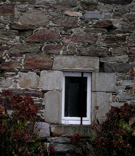 Vue de détail d'une ouverture de la maison noble de Saline : remarquer les pierres d'angle et le linteau chanfreiné sur une fenêtre moderne (pierres taillées en granite)Immatriculation