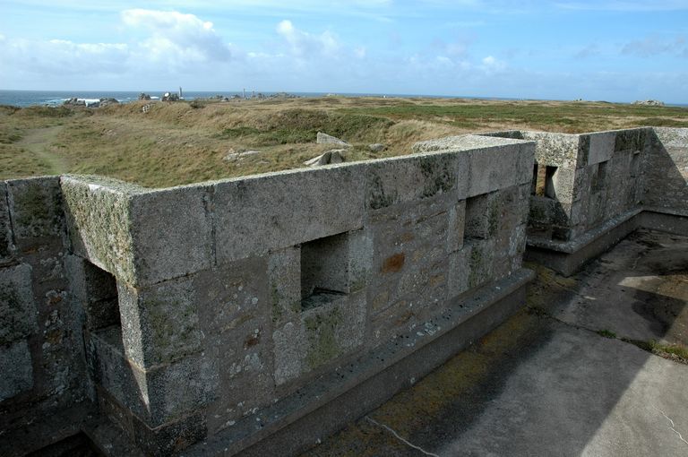 Vue du réduit de batterie de côte de Loqueltas. La terrasse est dotée de huit bretèches et créneaux de fusillade. En arrière-plan : la pointe de PernImmatriculation