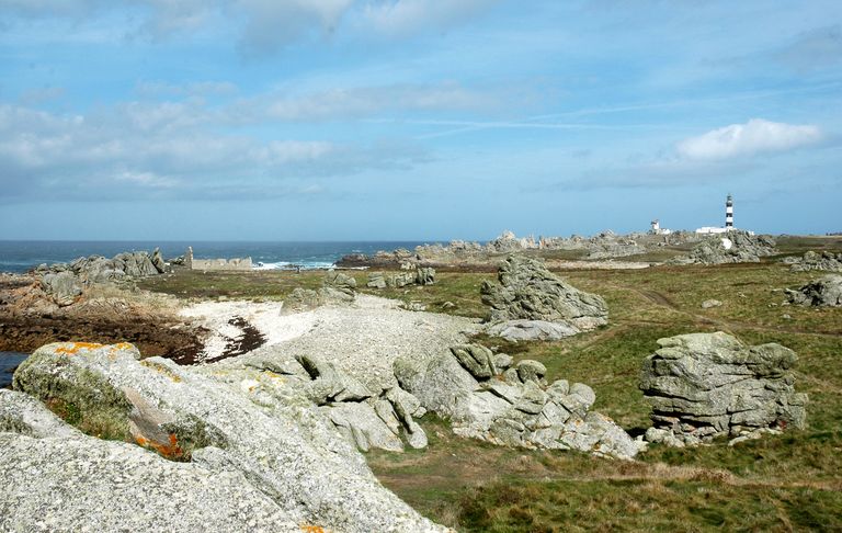 Vue de situation du bâtiment de la trompette à manège de Porz Aziou (1866). En arrière-plan : la phare du Créac'h (1863)Immatriculation