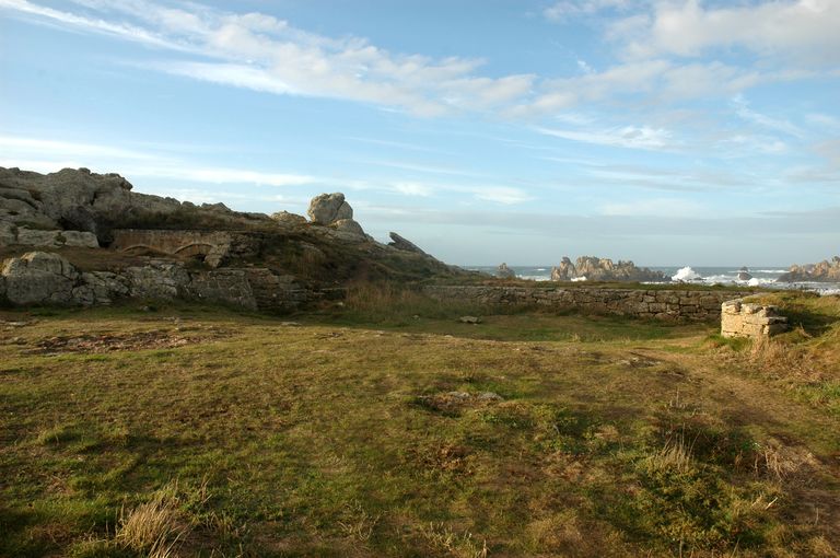 Batterie de côte (en angle droit ; 2 canons G de 95 mm sur affûts G de campagne) et niches à munitions du Niou Izella (Ouessant),