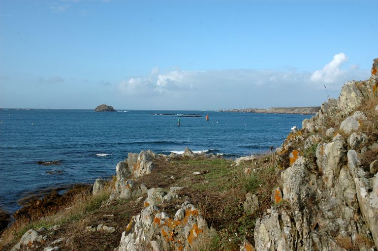 Vue de l'ensemble fortifié situé au nord de la plage de Corz, la baie de Lampaul et le rocher du KorzImmatriculation