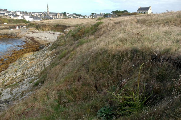 Vue de l'ensemble fortifié situé au nord de la plage de Corz, poste d'observation et de mitrailleuse en maçonnerie construit dans le flanc de la falaiseImmatriculation