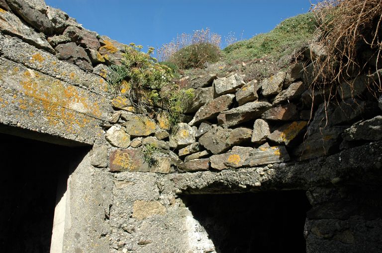 Vue de l'ensemble fortifié de Penn ar Viler, abri bétonné souterrain, position pour un canon de défense antiaérienImmatriculation