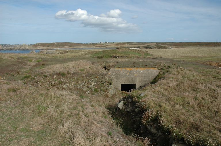 Vue de l'ensemble fortifié de Penn ar Viler, blockhaus abri à personnels, tranchée d'accèsImmatriculation