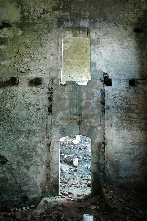 Vue de la caserne défensive Robert : mur de refend percé de deux portes axiales en segment appareillé (granite de l'Aber-Ildut)Immatriculation