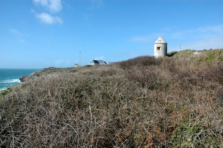 Vue générale de l'ensemble fortifié de Porsfeunteun : batterie de côte et guérite. En arrière-plan : la pointe du RenardImmatriculation