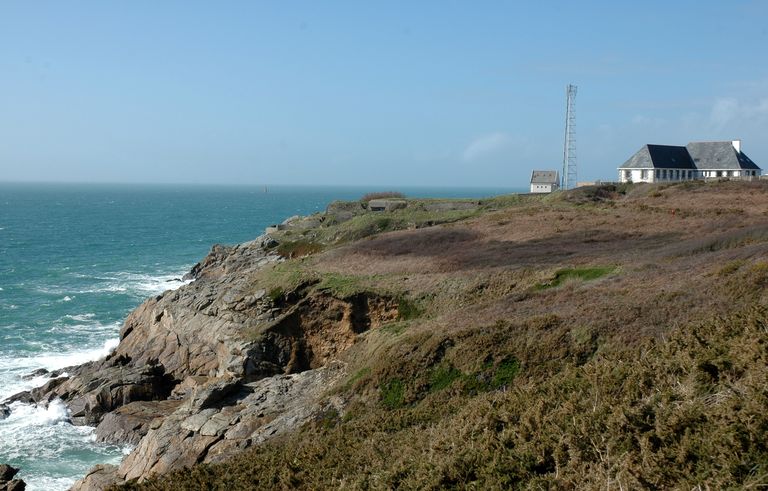 Vue générale de l'ensemble fortifié de la pointe du Renard : batterie de côte et casemate allemande. Sur le plateau : les bâtiments de radio ConquetImmatriculation