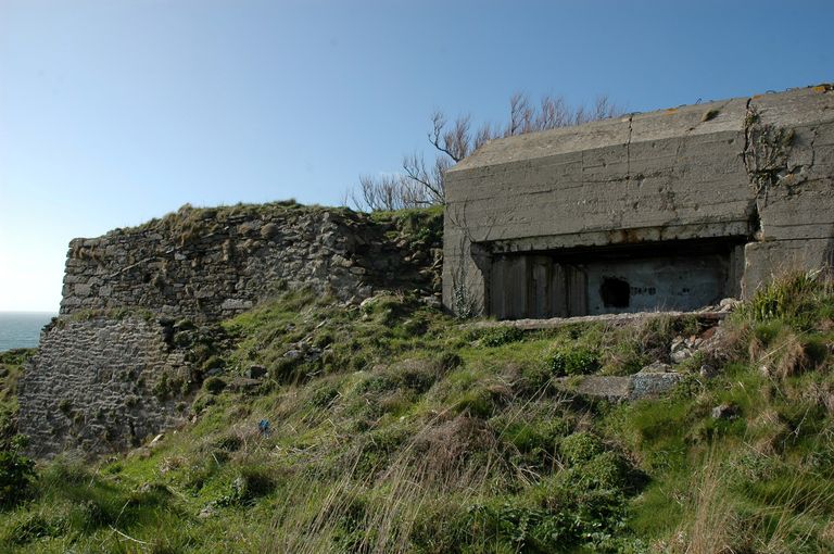 Vue de l'ensemble fortifié de la pointe du Renard : casemate pour canon de 75 mm orienté vers les pointes de Penzer et Saint-Mathieu aménagée dans le prolongement de la plate-forme de la batterie de côteImmatriculation