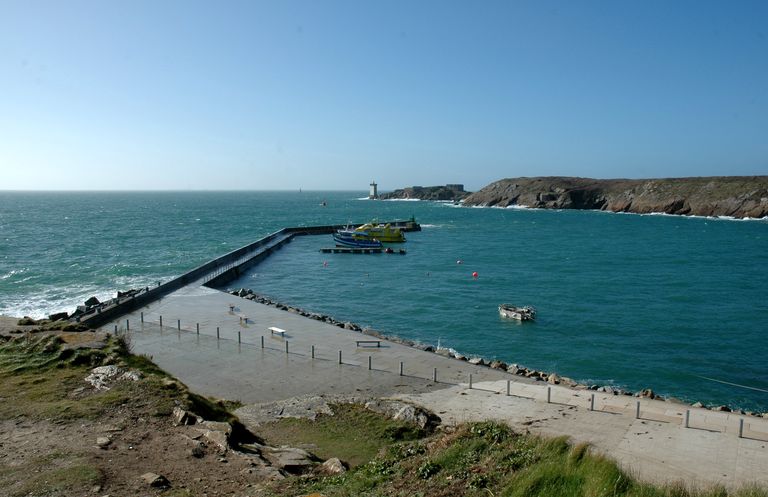 Vue de l'entrée du port du Conquet. En arrière-plan : l'ensemble fortifié de la pointe de Kermorvan et son phareImmatriculation