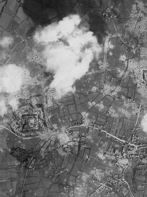 Vue aérienne verticale des forts de Montbarrey et de Keranroux et des fossés anti-chars situés à l'ouest de Brest, septembre 1944Immatriculation