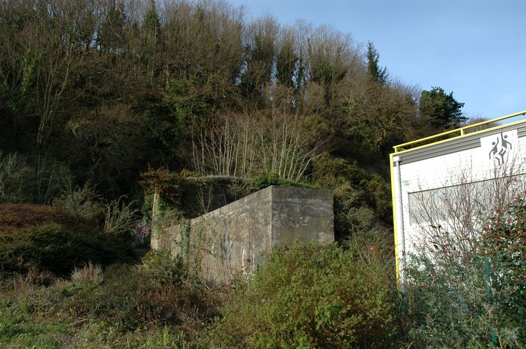 Vue des vestiges des fortifications d'agglomération de Brest au Moulin à poudre : mur défensif percé de créneaux de mousquetterie de la porte de la BrasserieImmatriculation