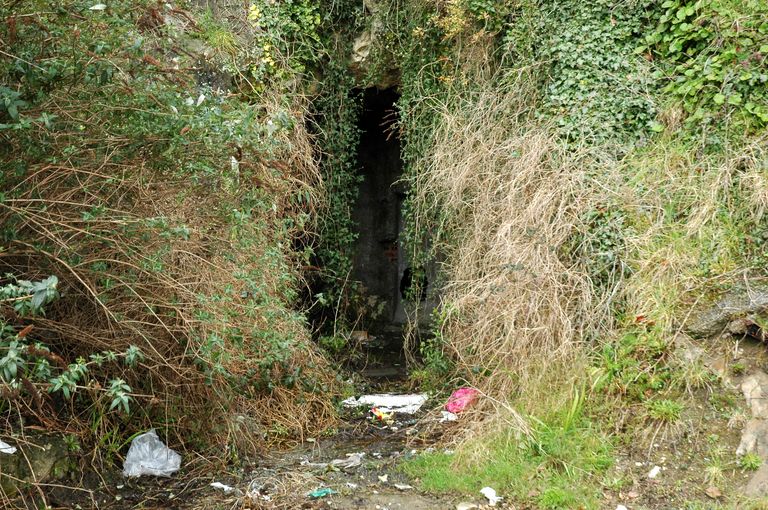 Vue des vestiges des fortifications d'agglomération de Brest : front bastionné du Cours Dajot. Entrée du tunnel allemand servant d'hôpital militaire aménagé sous la rampe construite durant le Second Empire pour le Port de Commerce de PorstreinImmatriculation