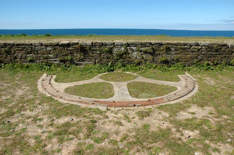 Vue de la batterie d'artillerie de côte et de sa plate-forme : emplacement de l'une des deux sellettes d’affût en demi-cercle reposant sur du béton pour un canon de 90 mm du poste de défense contre les sous-marinsImmatriculation