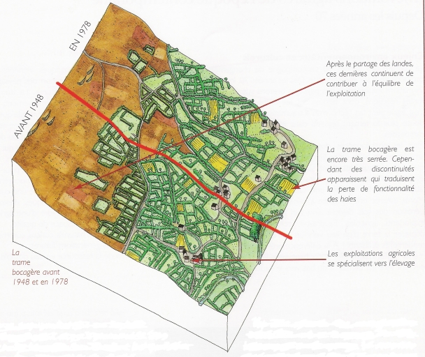 Bloc diagramme illustrant la trame bocagère avant 1948 et en 1978 dans le secteur de Kermabil, Kernaman et Roscoat. Conception et réalisation : Parc naturel régional d'ArmoriqueImmatriculation