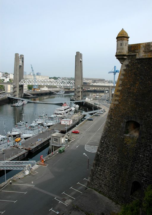 Vue de la guérite/échauguette du bastion de Sourdéac (à droite, embrasure à canon). Au second plan : le pont de RecouvranceImmatriculation