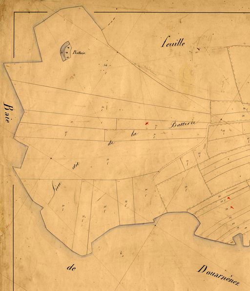 Plan de situation de la batterie de Plomodiern dit Saint-Sébastien, 1851, extrait du cadastre ancien de la commune de Plomodiern (Archives Départementales, Finistère, 3P234_004)Immatriculation