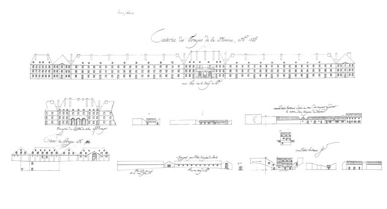 Elévations des établissements maritimes du port de Brest, année 1807. Caserne des troupes de la Marine, n° 135. Citerne du bagne, n° 134. Hangar pour l'école des pièces de bordImmatriculation