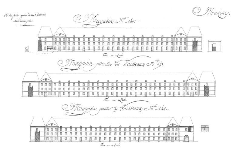 Elévations des établissements maritimes du port de Brest, année 1807. Marine. Magasin, n° 140. Magasin particulier des vaisseaux, n° 141. Magasin particulier des vaisseaux, n° 142Immatriculation